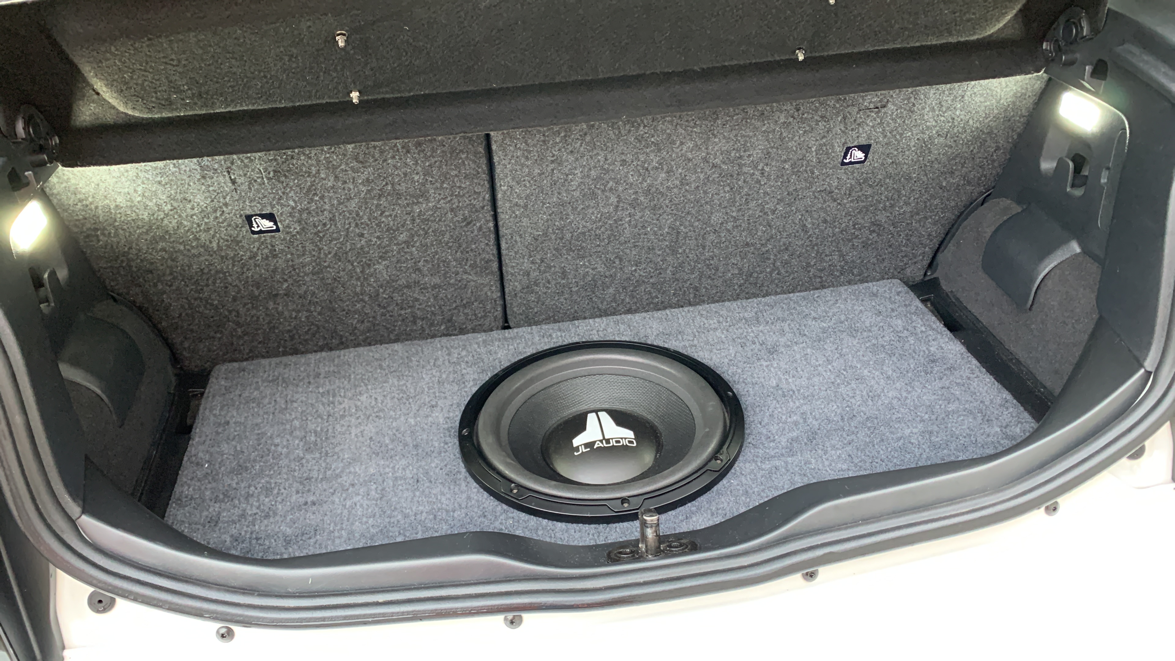 Er ligt nu een kleine subwoofer van JL audio in de kofferbak.